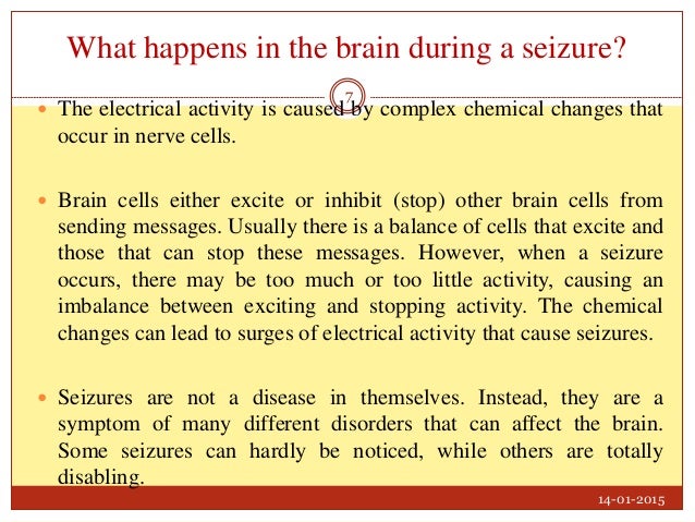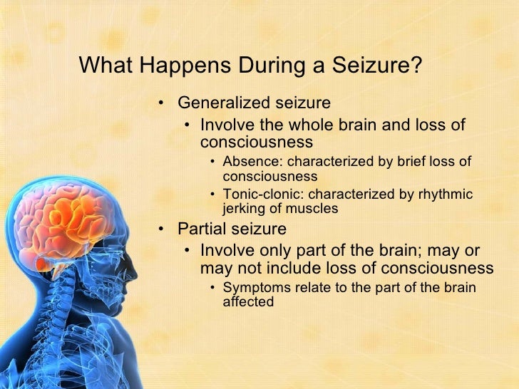 Parts 1 caring for the person during a seizure 2 determining whether to call emergency services when someone is having a seizure, they may experience involuntary uncontrollable muscle. Absence seizures, or petit mal seizures, are a type of epilepsy. It depends what happens be what type of seizure you have. Anything from a thought to an action creates a pulse from a neuron. What happens during a video eeg test? A seizure occurs when part(s) of the brain receives a burst of abnormal electrical signals that temporarily interrupts normal electrical brain function. The type of seizure depends on which part and how much of the brain is affected and what happens during the seizure. When you're having a seizure, neurons begin to fire randomly. Learn about seizure types, what causes seizures, what happens during a seizure and what you can do if you see someone having a seizure. If possible, bring someone with you who saw you have a seizure. Some seizures can be prevented by taking prescribed seizure medication regularly, checking for diazepam (valium) and midazolam are benzodiazepines used for sedation during surgery and to treat seizures. This activity causes different symptoms depending on the type of what happens during a seizure? A seizure happens when the nerves in a person's brain act strangely.